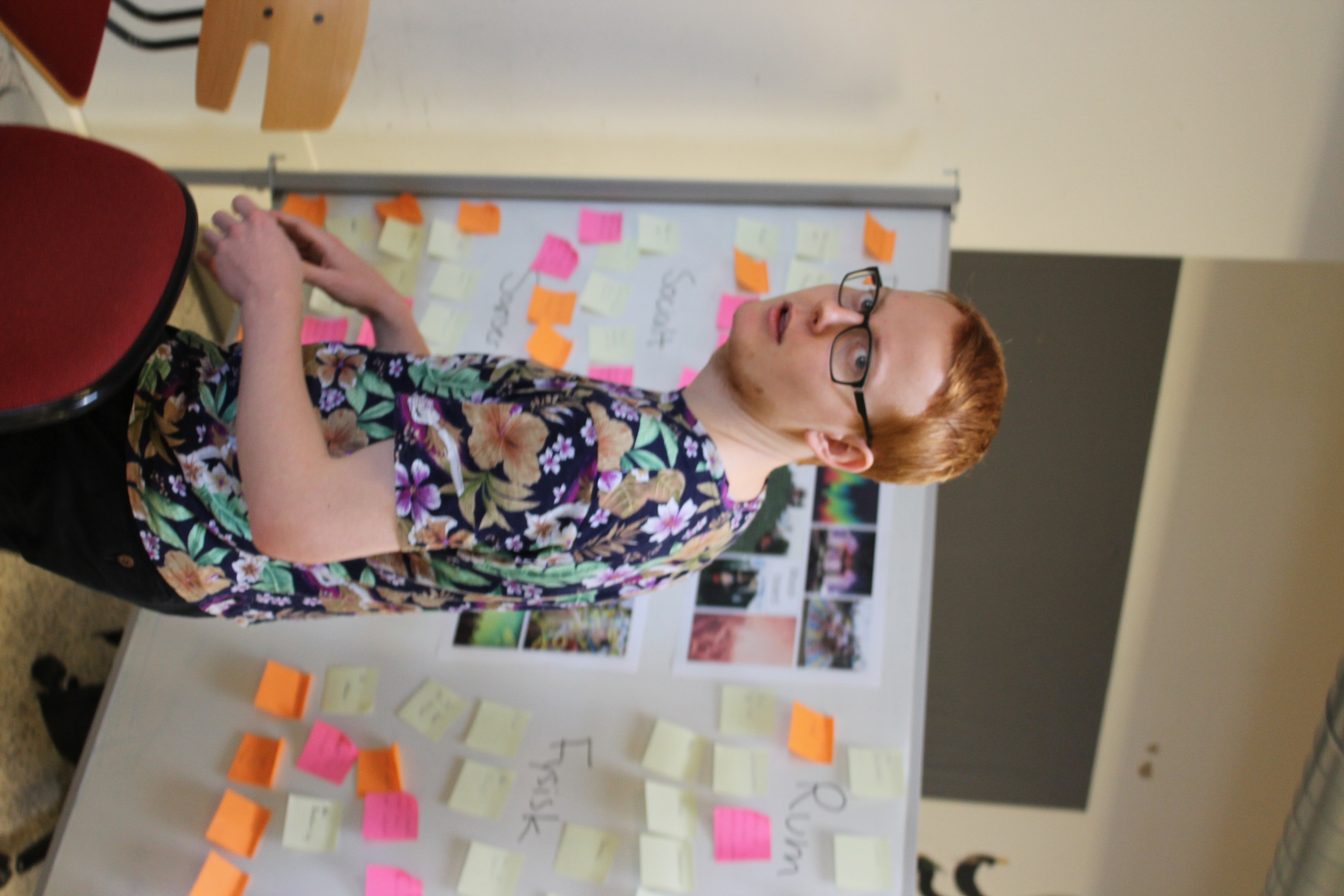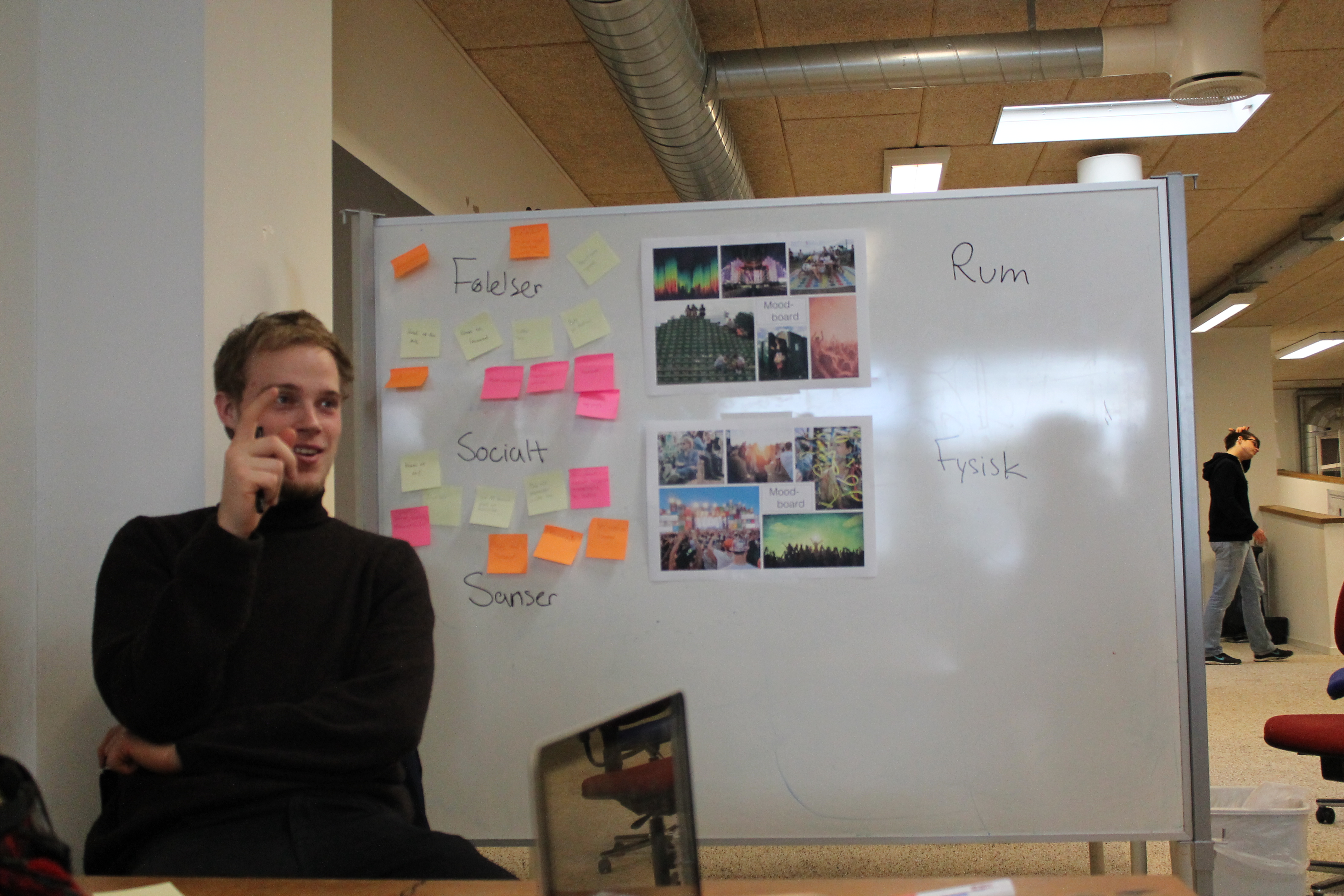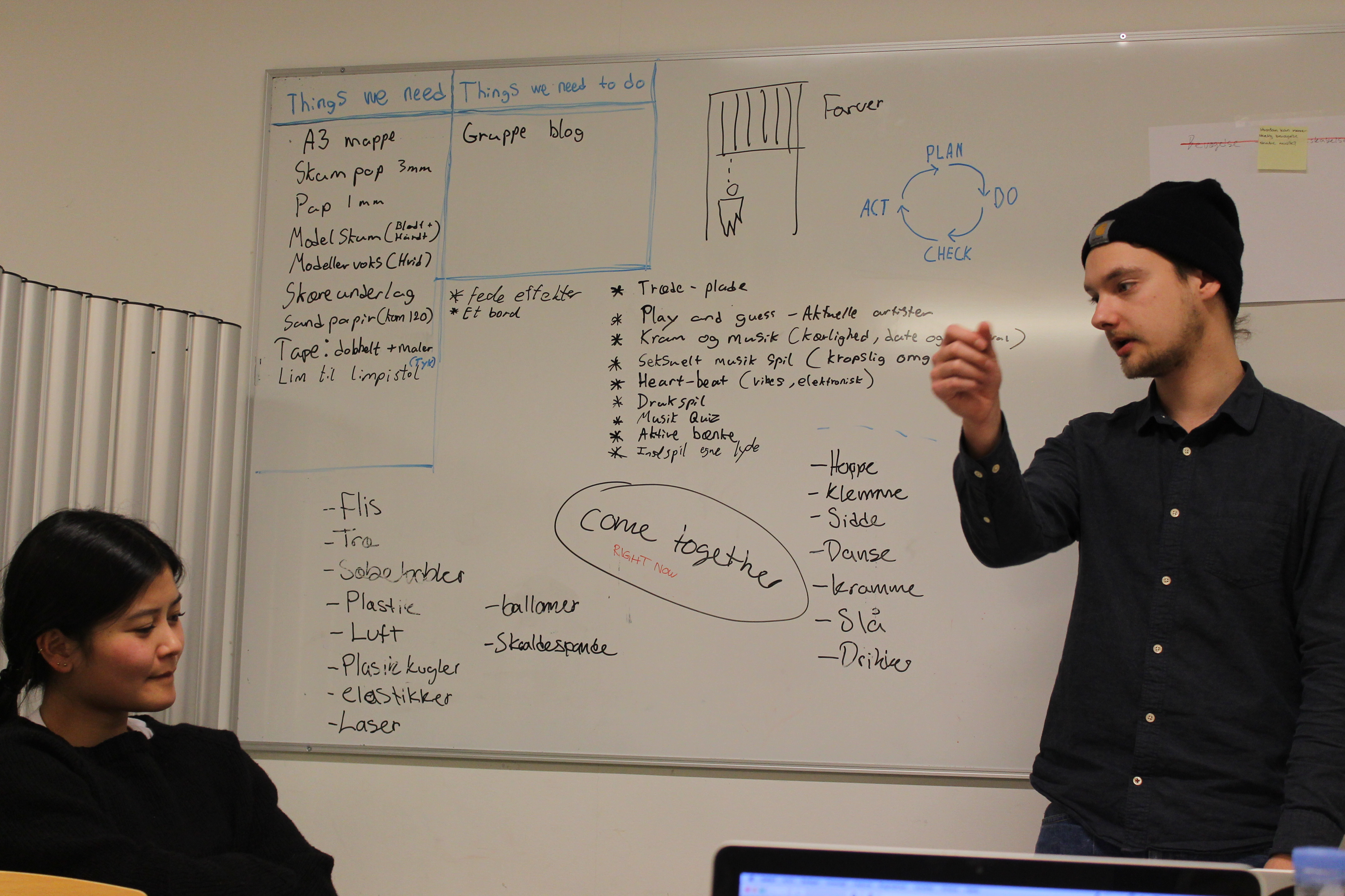 Mads løfter pegefingeren overfor vores idéer. Husk at ingen idéer er dårlige under brainstorming!